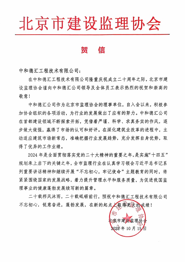 2024年10月15日,正值中和德匯成立20周年之際,公司收到了北京市建設監理協會的賀信。這封賀信不僅對公司過去20年砥礪奮進和卓越成就的認可,更是對我們未來發展的美好祝愿。在這個重要的時刻,我們謹向所有關心和支持我們的朋友及行業協會表示最誠摯的感謝。您們的支持和信任是我們不斷前進的動力。